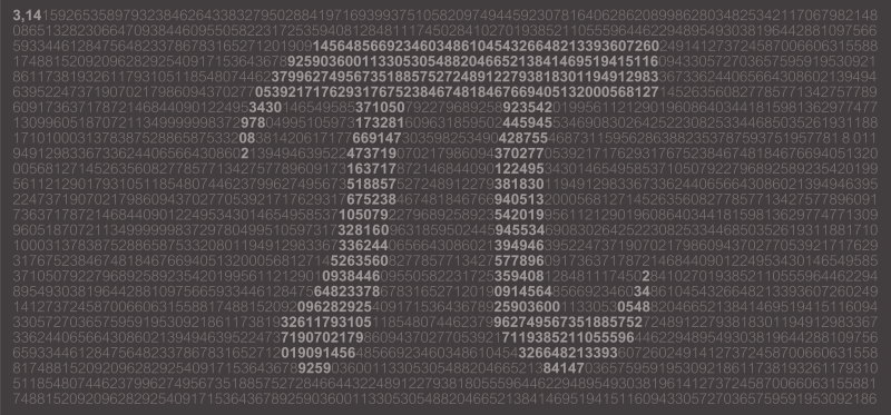 “Pi (π) is het getal dat aangeeft hoe vaak de doorsnede van een cirkel in de omtrek past. Het bijzondere is dat de cijfers achter de komma oneindig doorgaan zonder dat er ooit een vast patroon in komt. Door die oneindige chaos zit elke cijferreeks die je maar kunt bedenken – zoals je pincode of telefoonnummer – waarschijnlijk ergens in Pi verstopt.”