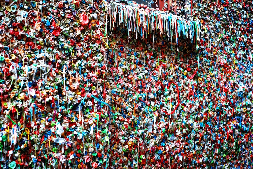 In een steegje in Seattle vind je de “Market Theater Gum Wall”. Deze muur is op sommige plekken bedekt met een laag kauwgom van wel meters hoog. De traditie begon in 1993 toen wachtende theaterbezoekers muntjes met kauwgom op de muur plakten.